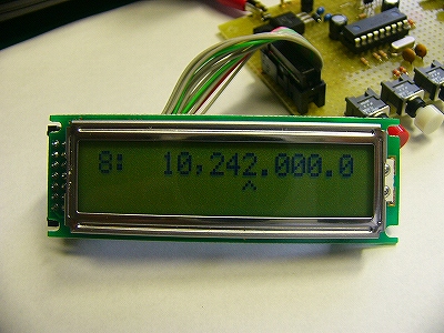 構成はこれだけです。 PIC16F88とLCD他わずかなパーツ。 5個のスイッチはメモリーチャンネルの切替とLO周波数、表示周波数の 書き換え、編集用です。 |