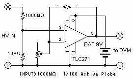 これにテスターをつなげば1/100表示の高入力インピーダンスアクティブプローブとなります。