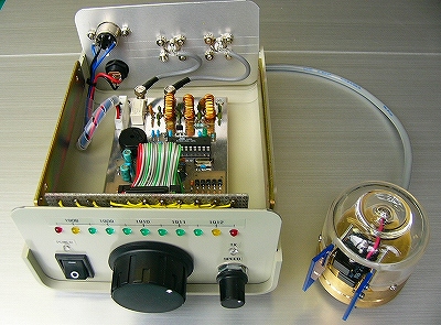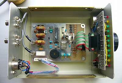全体です 11個のLEDによる周波数表示(500Hzステップ) 大きなVFO(VXO)つまみと小さなエレキースピードつまみ トロイダルコアは高調波を押さえるローパスフィルタ パドルも自作です。 基板もプロに頼んじゃいました。 |