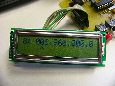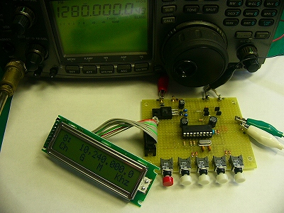 構成はこれだけです。 PIC16F88とLCD他わずかなパーツ。 5個のスイッチはメモリーチャンネルの切替とLO周波数、表示周波数の 書き換え、編集用です。 |