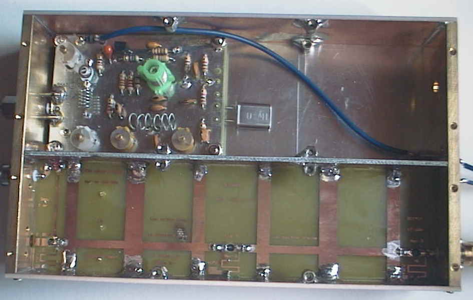 1/2波長BPFを短くし,出力+7dbm。しかしスプリアスは-30から-40db程度。出力にインターデジタルフィルタを