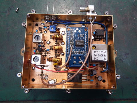 ヤフオクにあった60MHzTCXOをDDSに注入。 DDS基板上のLPFは殺し、AD9850の21ピンの200Ωから信号を取り出す。 LPFは外付けで 2SK241,2SC1815でアンプ後50Ωで出力 出力レベルは+10dBmにVRで調整、DBMに直結なのでこのくらい必要。 DDSのコントロールはPIC12F683で行った。 |