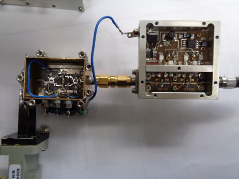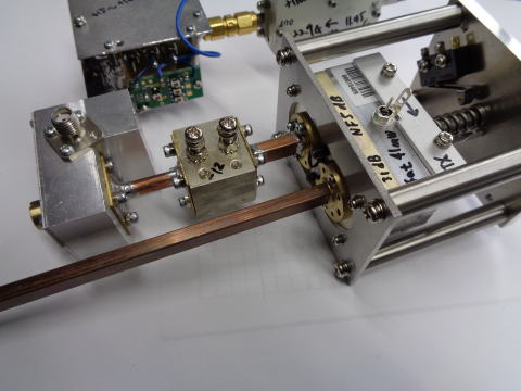 11.45GHzx2+アンプ+ハーモニックミキサ+BPF+47GHzアンプ ミキサの円形出力は同パイプを変形させ角型もどきでBPFに接続 47GHzアンプだが、KUHNE製LNA472B ゲイン31dB、NF5dB、出力41mW(sat)という性能。 これを送信/受信で方向を180度切替、1つのアンプで共用するわけ 回転のためのベースプレート(WP472B)とかWR19フランジ、導波管も必要 アンプの回転は手動とした。機構は適当にシャフトとかミスミで調達。 バネはある程度はバネ定数を計算して用意しないと回転がスムーズでないとか アンプが浮くとかするので注意。 アンプの出力/入力はアンテナに直結となる |