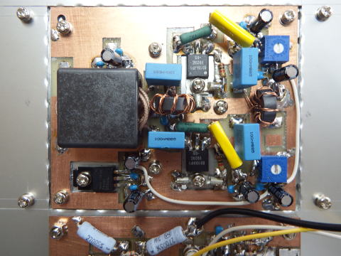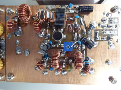 RD16HHF1のP-P構成のファイナルアンプ。 13.8Vで20Wぐらいまではリニアに増幅されるようだ。 ただしアイドリング電流が多いので効率は良くない。 |