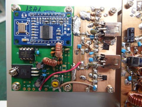 送信ドライバーアンプ DBMで得られた5.3MHzをファイナルアンプまで増幅する RD06HHF1を2段構成とした。 1段では不足、2段では過多、ATTを2か所ほど入れて調整 ちゃんと作らないと発振する。 |