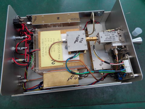 パイプキャップフィルタ2段付き逓倍基板。 2GHz帯を9から12GHzに逓倍する。 パイプキャップフィルタのプローブのSWRが悪く3段FETということもあり 発振しやすい。古いBSコンバータに付いていた電波吸収体でおとなしくさせる。 |
