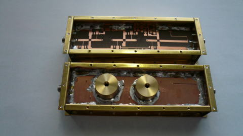 OCXO 99.5833MHz 24逓倍器 2.39GHz 4逓倍器 GaAsFET3段 9.6GHz 9.6GHzアンプ +15dbm 4逓倍器 38GHz CMA382400 8Vは送受で電圧を切り替えている。 ミキサ HSCH9251ハーモニックミキサ IFユニット 送信は+7dbm、受信はアンプ無し ミキサはDB6NT(KHUNE)の基板を使った。 LO(38GHz)は導波管入力、出力は2.6φのアルミケースを切削で作った HSCH9251は藤倉のドータイトで接着したが揮発が早く使いにくい、 昔使った2液導電接着剤は良かったが入手できない。 |