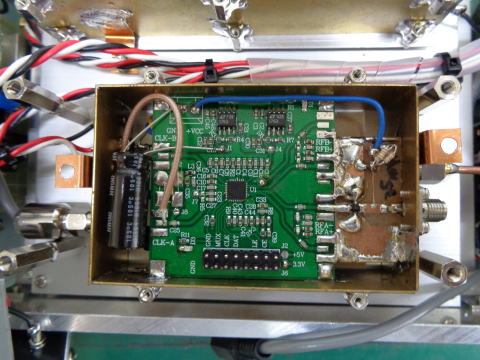 LO部 これ重要な場所なのだが最初はADF5355を使って9.7GHzを作る予定だった。 ただADF5355の各種基板に共通のようだがカタログ値ほど出力が得られないようで 色々いじった結果OUT-Aから4.8GHzを出力、NLB310でアンプ、+5dbmぐらい それをFET3段で2逓倍、増幅 9.7GHzで+16dbmぐらいを作ってミリ波ユニットの VCO部に注入した。 ケミコンは超低ESRの6.3V3300uFでVCOの5Vラインに入れている、 スペアナ見ながらこれ入れると驚くほど影響が見える ADF5355のクロックは26MHzぐらいのVCTCXOを使った。 マイク−マイクアンプの出力をこのVCTCXOに接続、FM変調を掛けてみた。 このやり方はお勧めできない、77GHzで±7KHz動かそうとすると0.1ppmで電圧は 17mV程度になってしまいもっと感度を落とした物でないと厳しい。 色々回路も実験したが納得できていない。 やはりクロックの出力に可変リアクタンス位相変調を掛けるべきかと。 注入する周波数は送信時9720.0MHz、受信時9719.75MHz 受信時にIF周波数2MHzぶんシフトする。 ADF5355への書き込みはOIC12F683だがこのあたりは別ページでまた。 |