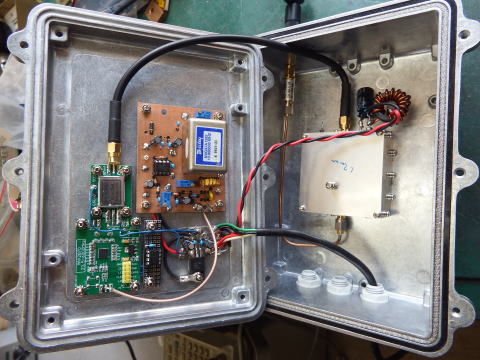| 一番時間をかけたのは変調回路でOCXO出力にF2A変調をうまくかけることができた。 OCXOはマイナス7乗台で数百Hz以内の誤差となっている。 直接発振で逓倍なしのためスプリアス領域はスプリアスが少なく、除去も簡単である。 しかし帯域外領域はPLLのためおかしなスプリアスが隠れているので注意が必要である。 今回の2台とも新スプリアス基準を満足していると判断している。 ビーコンのモニタは 5.7GHz用コンバータ 、 2.4GHz用コンバータ を使っているが調子が良い。 ビーコンの周波数は勝手に決めた。特に5.7GHz用はメインチャンネルのすぐ下としている。 JARLはビーコンバンドを決めているが、あの周波数帯はビーコンしか出せないし、中途半端に メインチャンネルから遠いのと、特にJARLと縁があるわけではないので、全電波形式の帯域とした。 周波数: 5759.84MHz 2424.80MHz 谷間なので広いエリアは無理。 |