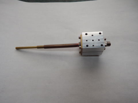 導波管は5x2.5mm。 これを銅パイプで角から円筒に変換している 基本的にはここが信号入り口、パイプ径をいろいろ変えることで ハイパスフィルタとなる。 SMAコネクタがスペアナの外部ミキサ端子につながる。 |