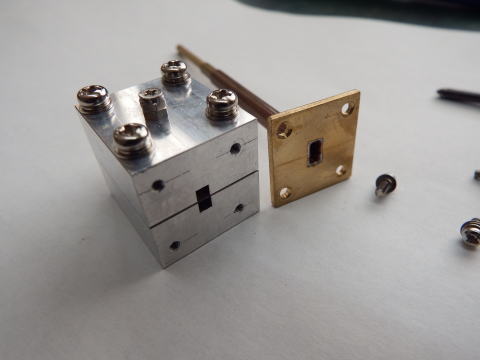 心臓部はアルミ切削部品2つで極薄基板をはさむ。 基板は0.125mmのテフロン基板、裏面の銅箔は無く片面基板状態 パターンは適当に決めており計算とかしていない。 扇形の導波管-マイクロストリップ変換部は5x2.5のサイズの導波管内に 入っている。 重要部品のダイオードはMA4E1317 シングルダイオードを使った。 変換部とラジアルスタブのあいだに載せている。 ダイオードの実装は銀ペースト系接着剤でも良いと思うが今はハンダ付けしている 基板にハンダメッキ−ごく少量のフラックスを塗り−ダイオードを載せ− ハンダペーストを極少量塗り− リフローもどきでハンダ付け 顕微鏡は必須です。 |