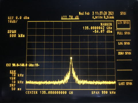135GHzもこんな感じで見えました。 信号源は6倍+1.2Gのハーモニックスミキサの出力なので相当弱いと思う。 直流リターンについてはスペアナ側で直流バイアスを掛けることができるので この外部ミキサでは考慮していない。 ちなみに3mAぐらいを流し込むと感度が良くなる。 |