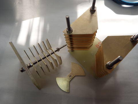 GI7bなる球があり部品もありこれを使って6m用アンプを作ろうかと思ったのだが、 ひとつだけプレートバリコンの良いものがない。パイマッチで作りたいし......... そんなわけで高圧プレートバリコンを作っちゃおうというわけ。 |