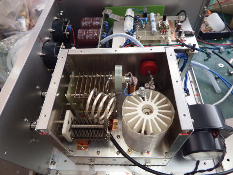 アンプ部は2重シールドで、普通のパイマッチにした。 カソード側から風を吹き込み、テフロンシート製のチムニー でプレートを冷やす。 パラ止めは付けていない。50MHzのパラ止めはどうなんだろ? |