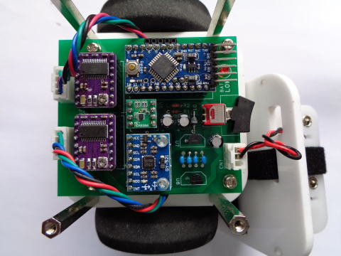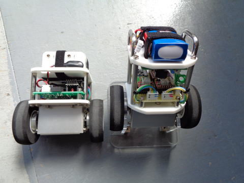 2輪ロボット CPUはArduino、角度センサはMPU6050 3軸加速度、ジャイロセンサ ステッピングモータードライバ2軸ぶん、35mm角ステッピングモータと電池 これらで2軸の倒れないようにPID制御をするわけだが、技術的にはすでに 完成されており、ソースコードも世間に溢れている。 ポイントは角度を得るためには加速度とジャイロの2つのデータから演算する 必要がある。相補フィルタ、カルマンフィルタがキーワード。 Githubあたりも参考に。 あとはモーター、タイヤ、トルクなどに合わせてPIDのパラメータをチューニング。 |
