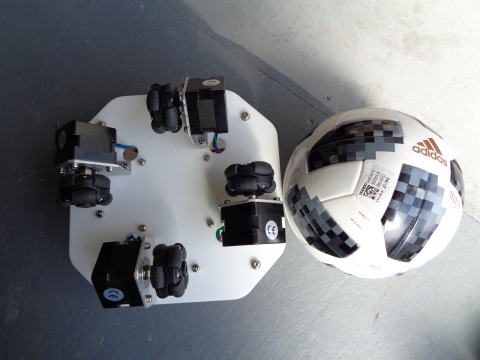 2輪を作って思ったのだが、 2輪を2台90度ずらして取り付ければ玉乗りができるのでは?と 普通玉乗りロボットを作るときは3軸3タイヤとし、XY2方向の傾斜を3軸に割り振る 制御をするようだが、とりあえずやってみた。 4軸の弱点は4タイヤに均等にボールを当てるのが難しいわけだが、ボールは やわらかいし何とかなるだろうというわけ。 結果は2軸のPIDパラメータをちょっと修正するだけでボールに乗ってくれた。 全体の重量に対しモーターが小さくトルク不足で制御できなくなる問題はあるが 意外と簡単に動いた。 |