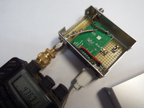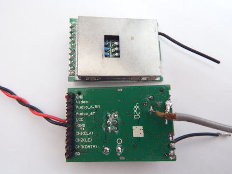 中華製 数百円で購入可能 2.4GHzアンプ、480MHzへのコンバータ内蔵 PLLで受信周波数をいくつも設定できる。 映像、音声信号も復調できるらしい。 |