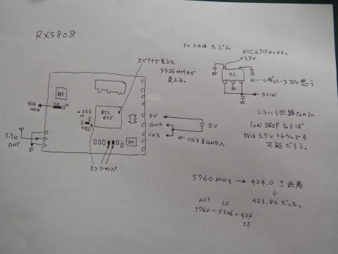 3か所のチップ抵抗のランドをジャンパする CH3端子をGNDへ落とす 5.7GHzアンテナをつなぐ 434MHz信号は480MHzフィルタ手前から取り出す。 電源は3.7Vから5Vでよいはず コンバータのLoは5326MHzでチップの表面 を探るとスペアナで見える 5326MHzはPLLで8MHzから作られているが 精度がよくないので5760MHz→434.0MHz とはいかない。200KHzぐらいずれているし 電源ON時結構動く。 |