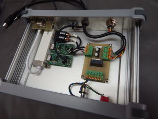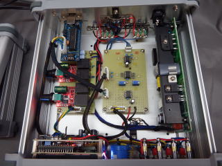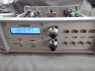 AZ、EL CONTROLER 仰角、方位角の制御に必要なものをすべて詰め込んだ。 PCが無くても手動制御できるようLCD表示と手動SWを付けた。 パソコンとの接続は、PC側でCALSAT32.exeで自動制御 するのでそれに対応したUSB I/Fの FSIOを使った。 2つのモーターの回転速度はPWMコントローラで可変できる。 モーターの回転正逆切替はリレー。 回転角度センサーの電圧はOPアンプでゼロ、フルのスケール調整後 AZ:0-360deg=>0-3.6V EL:0-180deg=>0-3.6V としPC側のA/Dに渡す。 ゼロ点はパネルのポテンショメータで調整できる。 |