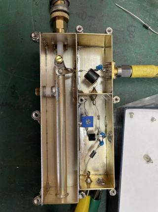 PRI AMP アンテナ直下に2個の同軸リレーとともに載せている。 30年ほど前、EMEをやったころ良く作りました。 入力は70Ωの同軸構造 Hi-Qトリマは持ってて良かった GaAS-FETは多分三菱のMGF1402かそのあたり ソースを浮かすベタコンも捨てなくて良かった。 ドレイン側はFB801のトランス式 ドレイン電流は15mAぐらい流し電圧は3Vとした 全体は銀メッキをかけた 調整はSGよりFMを加え了解度が最良になるようにしている。 経験上NFメータよりこっちのほうが良い。 NFメータはアンプの能力を評価するには良いがそのまま実装しても 再現できるとは限らない。 これでメーターの上ではサンノイズが見えた。 |