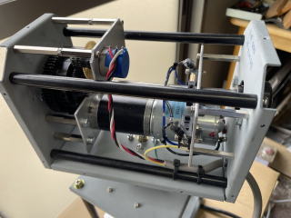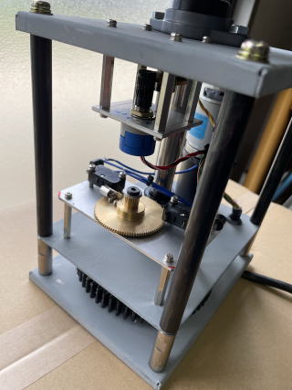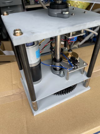 AZ ROTOR MOTOR:Type775 DC12V 7RPM 遊星ギアで7PRPMまで減速されている。 それをM2歯車で1RPMぐらいまで減速 回転角度センサーはBourns 3590S 10回転ポテンショメータ を使った。 センサーとしては約9回転で360度回る ようにしている。 Limit SW を使い回転角度を360degぐらいに 制限している。 |