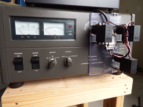 少し前引退近いTL922がやってきた。 ハイパワー改造はされていない。 バイアスや小さいRFCは壊れた形跡なし 電源線に修理の跡あり、ただ全体的に電線が硬化しており手を入れるのはいやだ。 出力は400-500W、バンドによっては300W出ない。入力同調に問題ありそう 部品取りでいいかもしれないがひとつ遊んでみたいことがありやってみた。 それはプレートVC、ロードVC、バンドスイッチをサーボモータで回しプリセット化しようというもの 安い模型用サーボを使うので制約とかあるのは承知で。 |